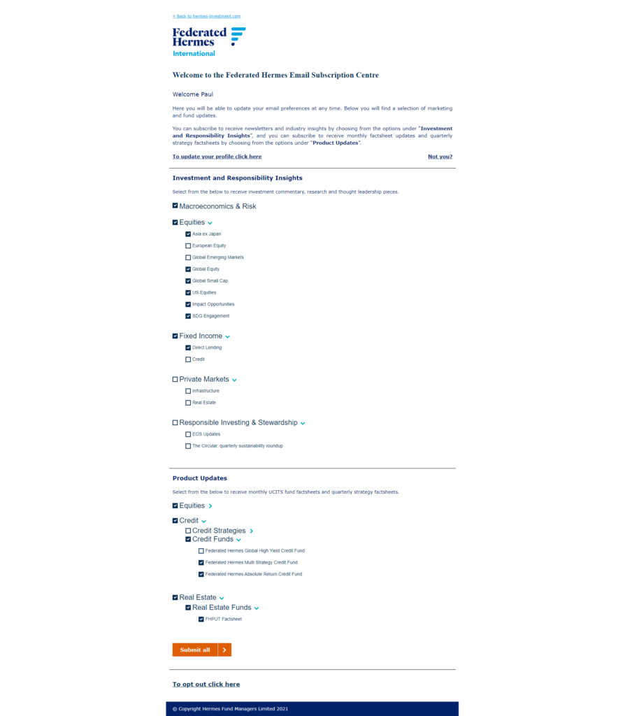 No one likes it when someone unsubscribes and there is the element where if they want to go then the least friction you offer the better. However, until the investor clicks Unsubscribe there are some options that you can offer. Some examples are changing the frequency of the emails, changing the funds being reported on or follow on just social media.