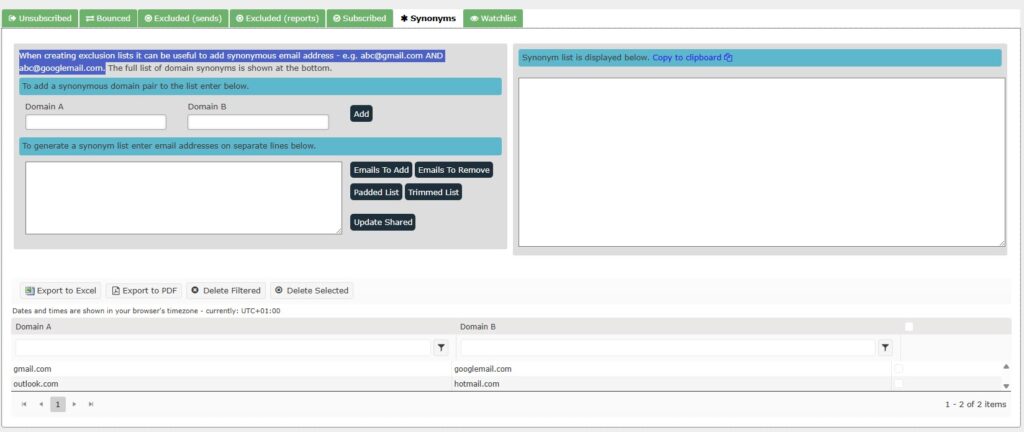 The Domain Synonym Tool automatically recognises and links equivalent email domains, allowing you to: