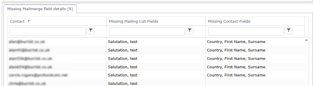 It will show each contact, along with which fields were missing and whether the system was expecting them to be part of the mailing list, or look them up in the Contact details.