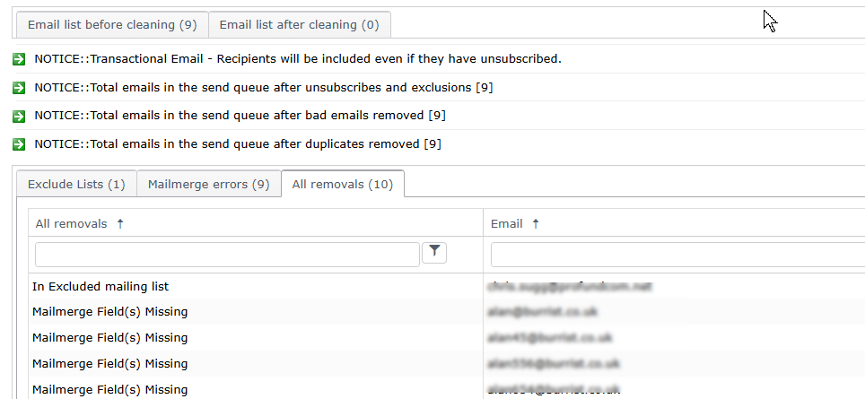 You can then either fix them and refresh the page, or choose to continue and the system will remove those emails from the send.