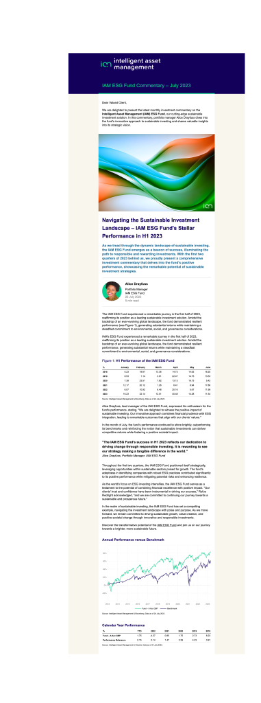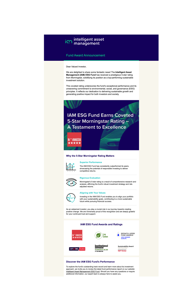 • However, this email also works to guide recipients through fund page links and a downloadable report landing page. This could spur further activity with other funds in a range. It’s easier to grab attention for other products after some good news!