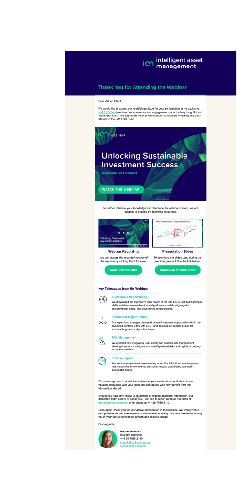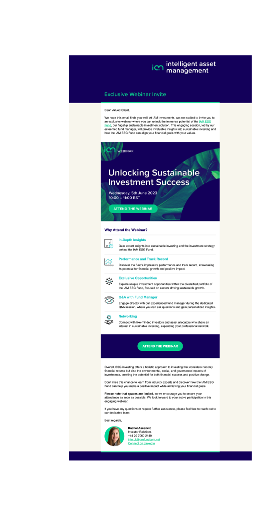 • Utilising the same as the webinar invite graphic looks familiar to all sign-ups. There’s consistency there, conveying what the email refers to immediately before they dive in and keeps them ‘locked in’ to the topic, event and fund at that crucial follow-up time.