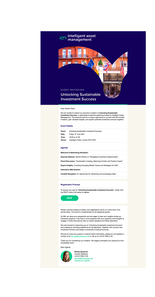 • Blending the event venue in with the fund’s branding in the hero image is a smart move: adding credibility and being eye-catching. A cut-and-paste stock image would look impersonal and not feel like a ‘real’ event in the same way.